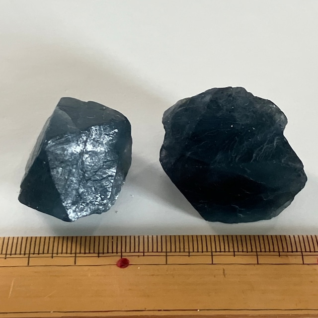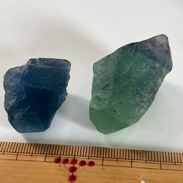 湖南省産蛍石の欠片2こ 合計50g 一個は青くて一個は緑。緑の先っちょは紫の縞があります。 耐水サンドペーパーを2種類つけています。 数字の小さいほう(ざらざら)で表面を削って整え、数字の大きなほうで仕上げてください。 もっときれいにしたい場合は、さらに数字の大きな耐水サンドペーパーを買って仕上げてみてください。