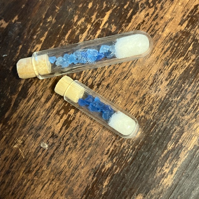 ミニチュア試験管に詰めるために割ったポーランド産の青い岩塩。 こののち、もっと透明度の高い青い岩塩を入手したため、使わなくなってしまいました。 箱ごと販売。