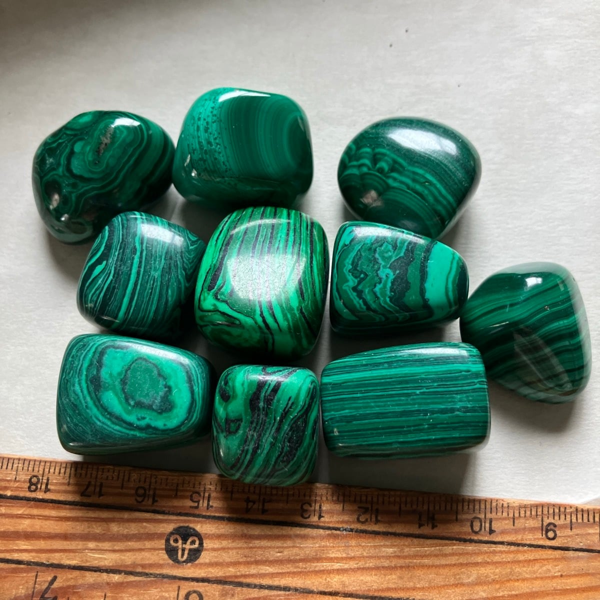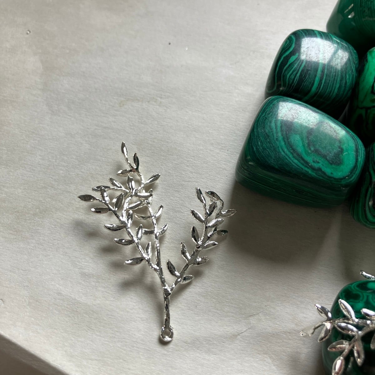 研磨された孔雀石のタンブルと、葉っぱデザインのワイヤーセットです。
