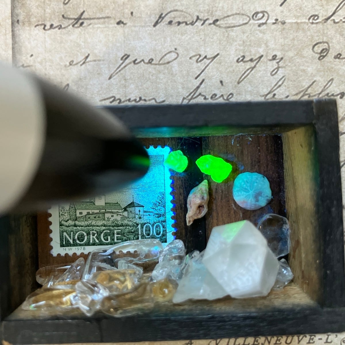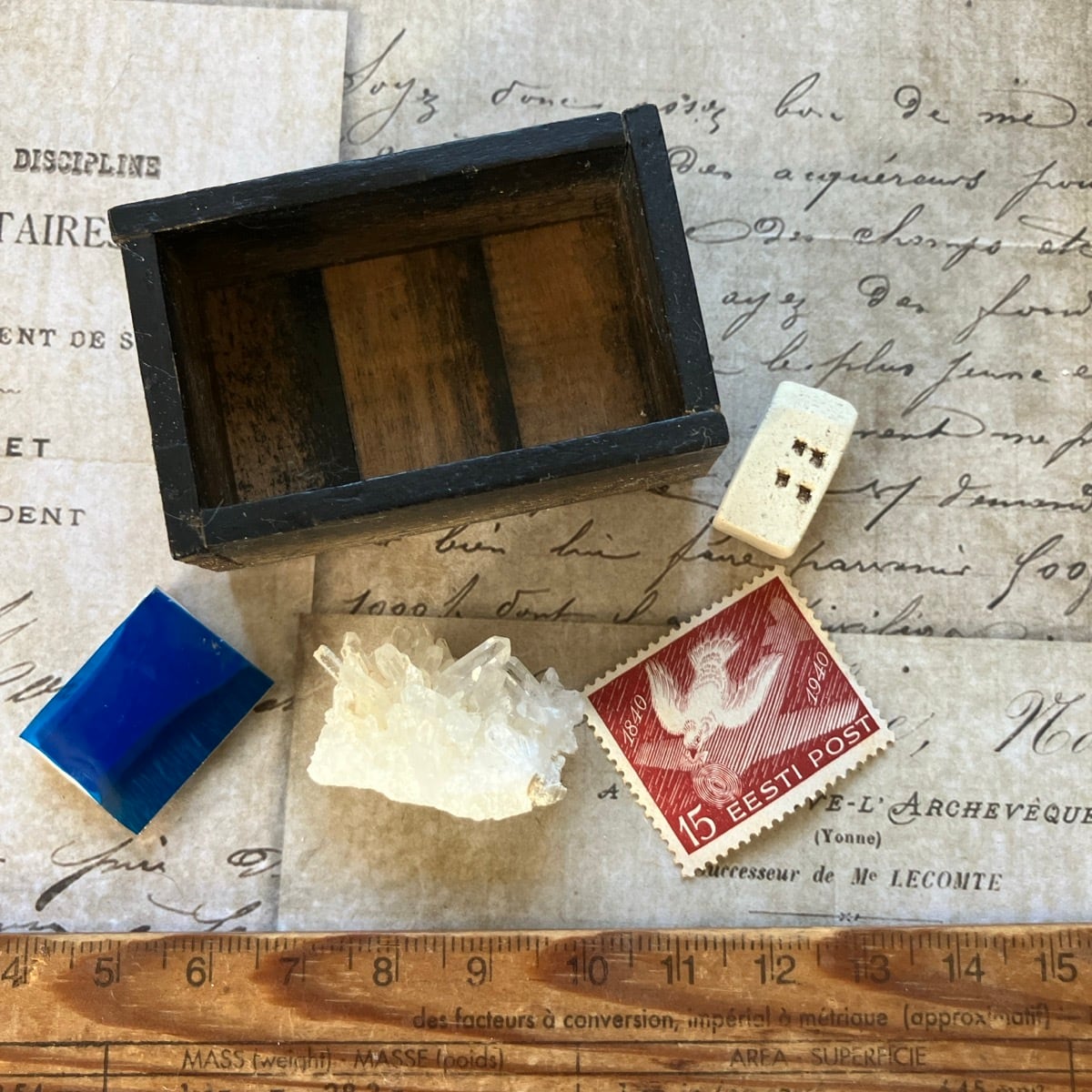 昔の活版印刷で使われていたインテルで作った箱と古い切手、鉱物などで小さなオブジェキットを作りました。