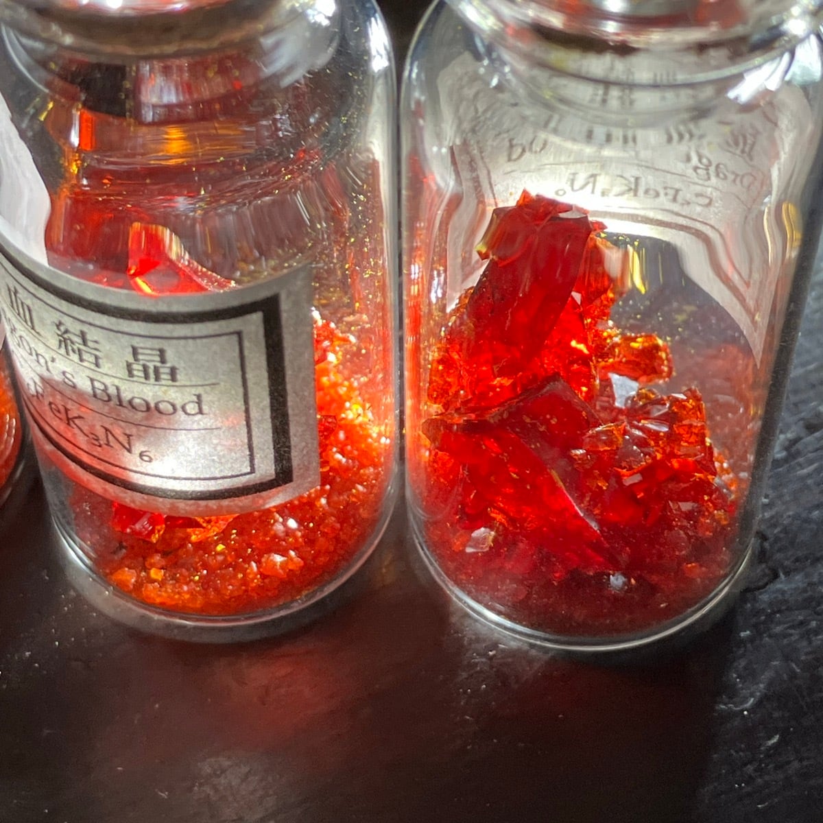 φ2×h4cm(ビンの肩まで)のコルク栓ガラス壜に、フェリシアン化カリウムの小さな結晶を入れました。