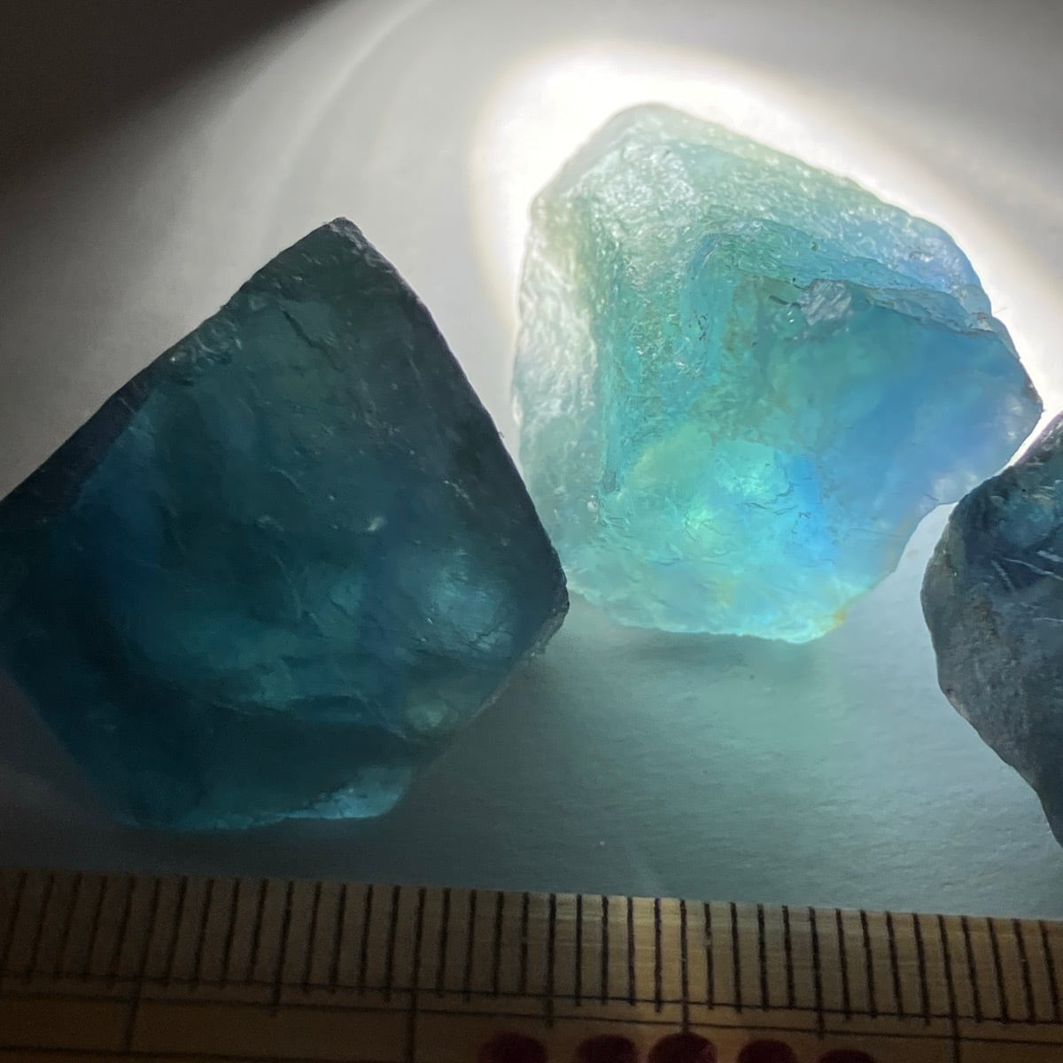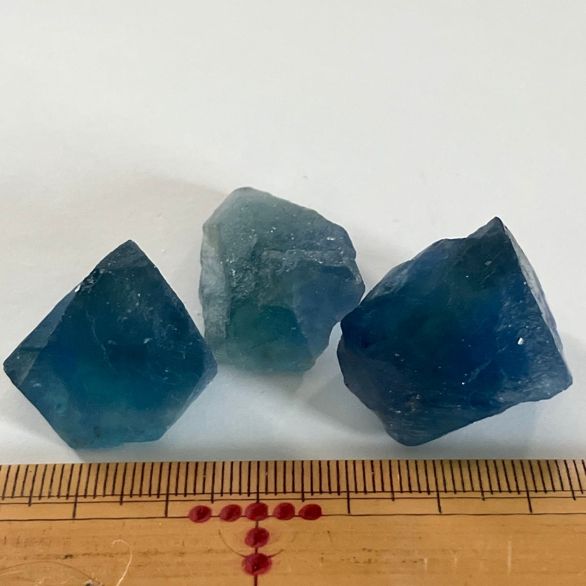 湖南省産の青い蛍石の欠片3つ。