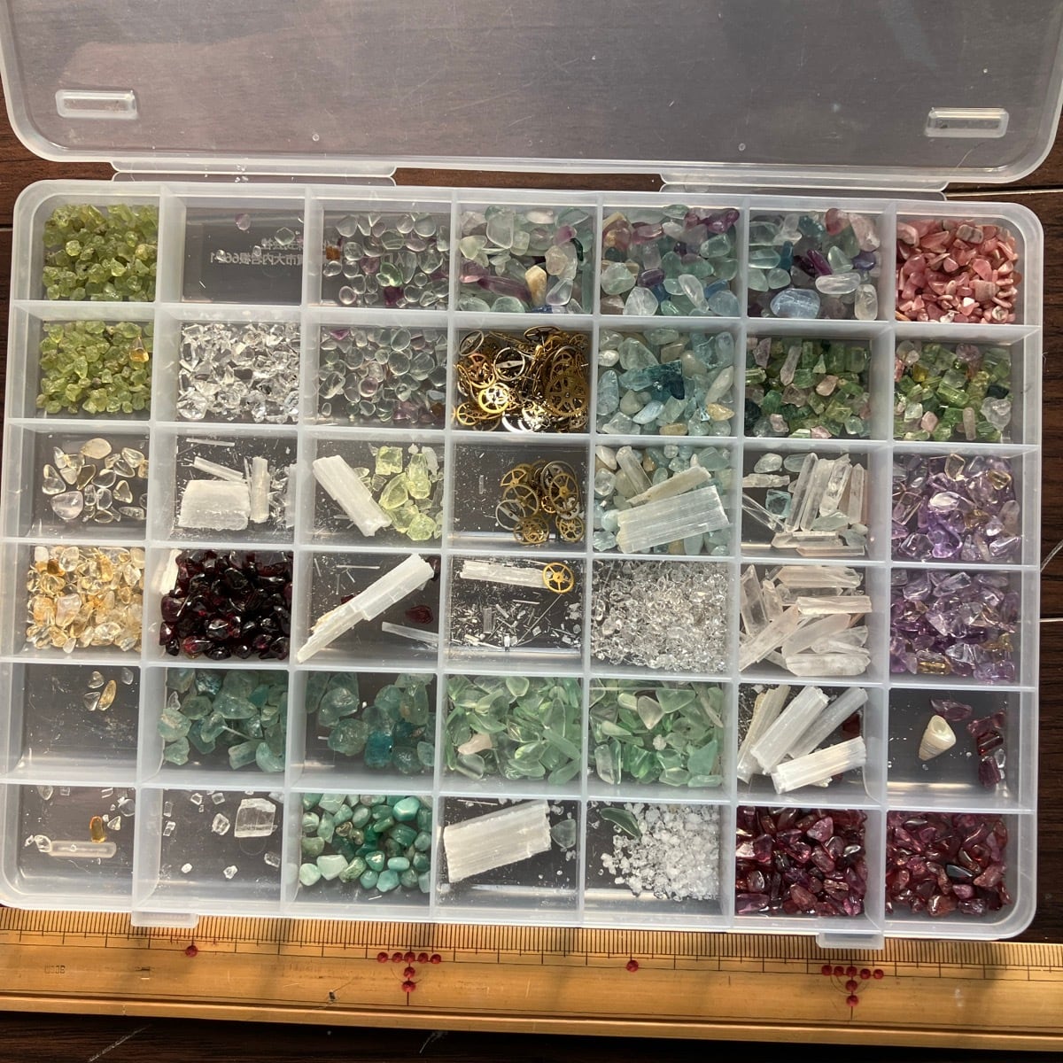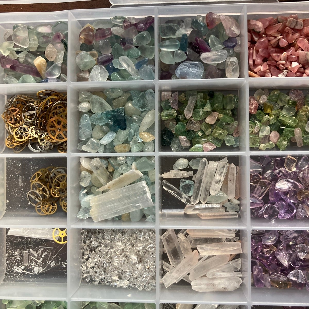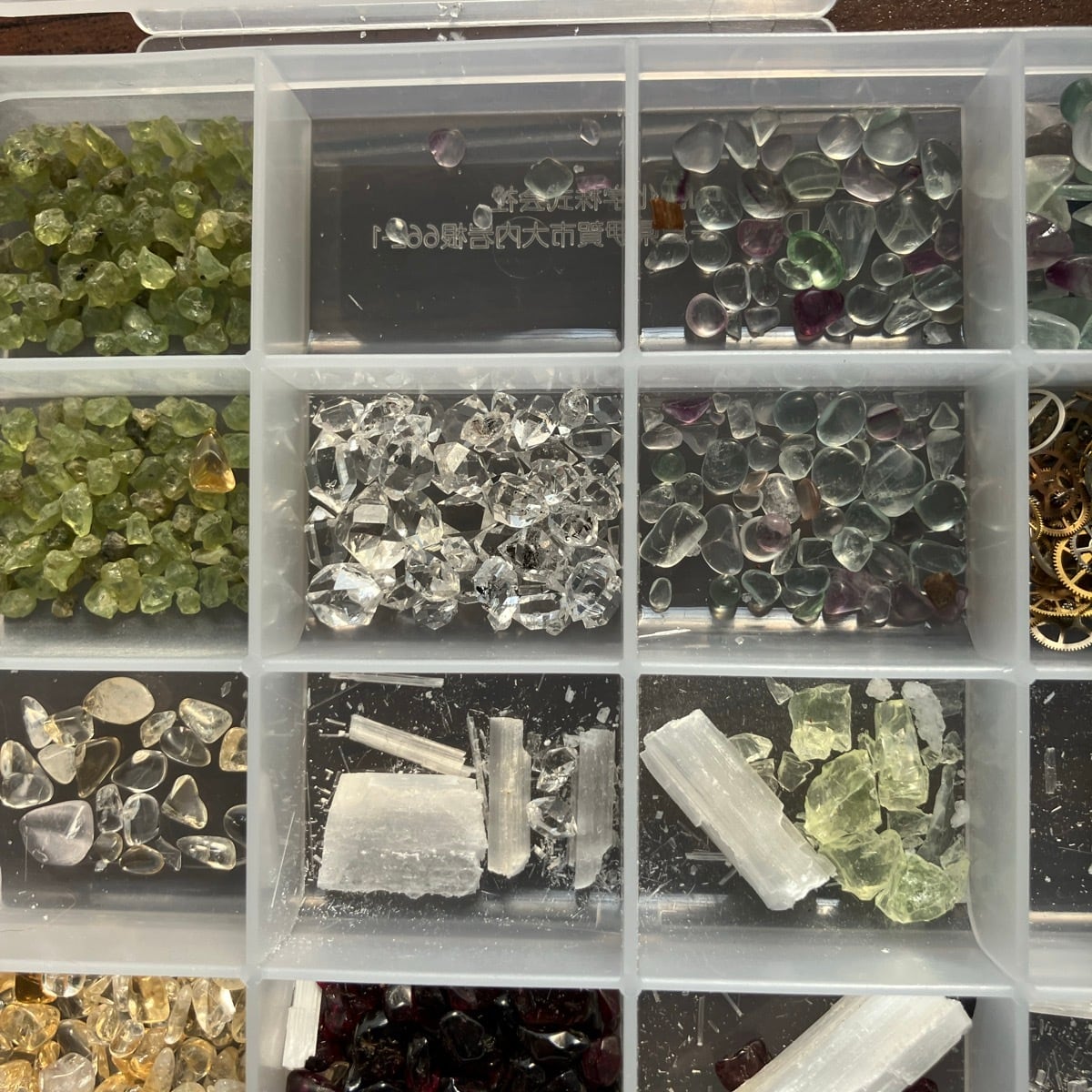 ウラングラスやアメトリン、菱マンガン鉱やハーキマーダイヤ。歯車はレプリカではなく本物です。