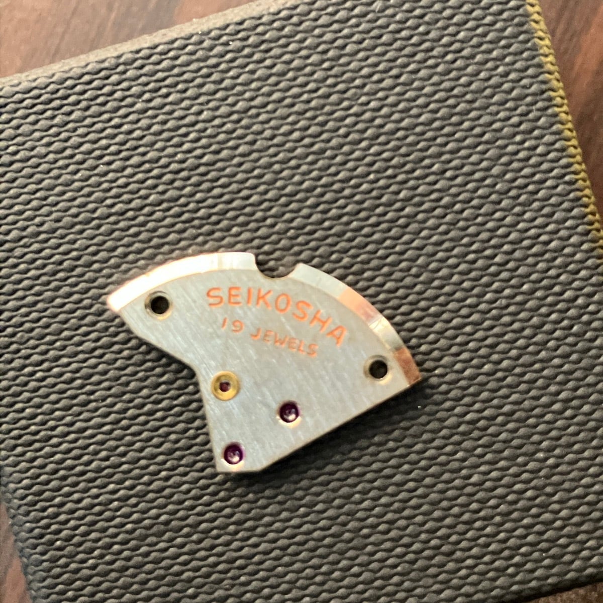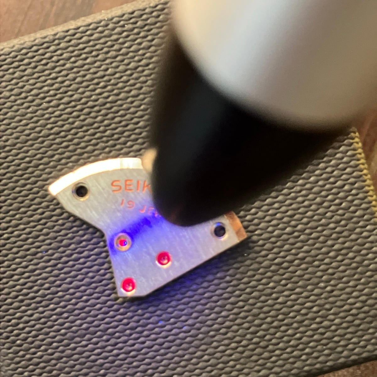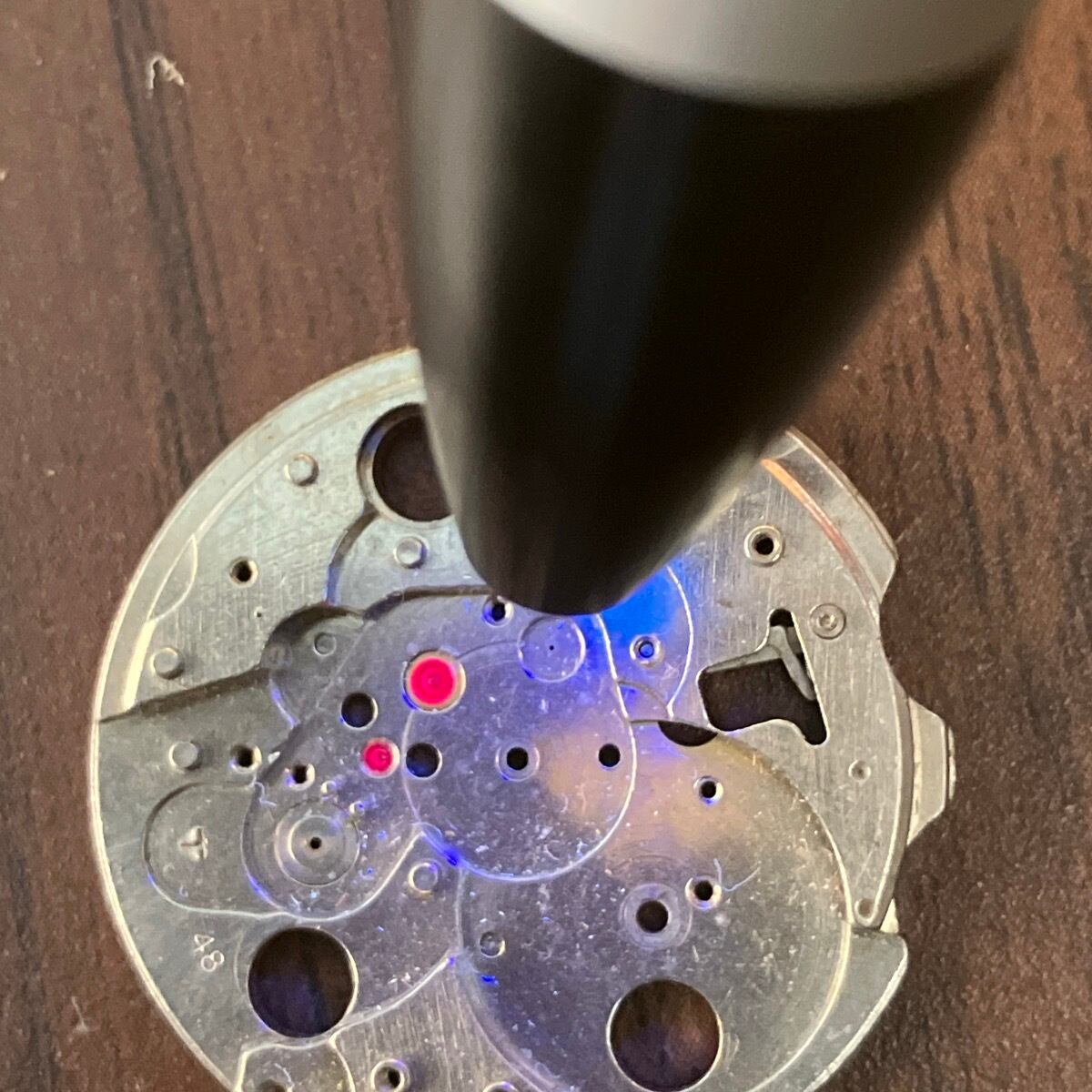 時計部品には人工ルビーが使われているので、ブラックライトで光ります。