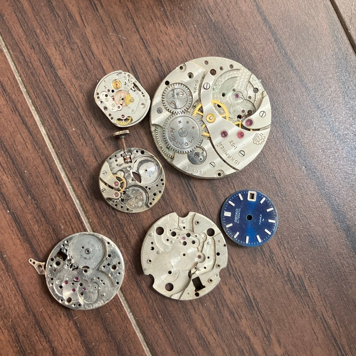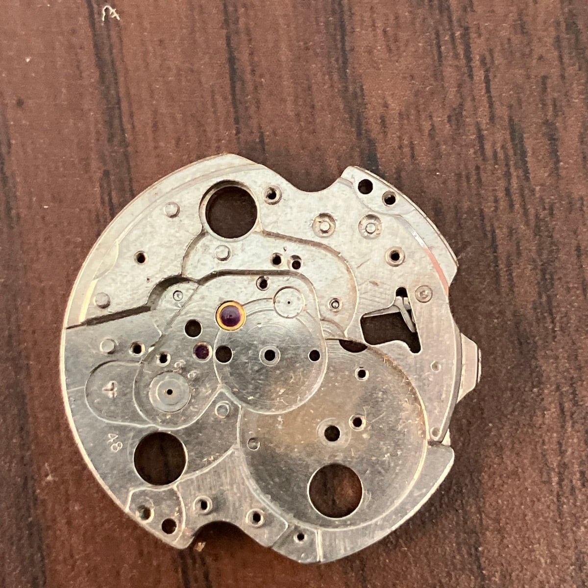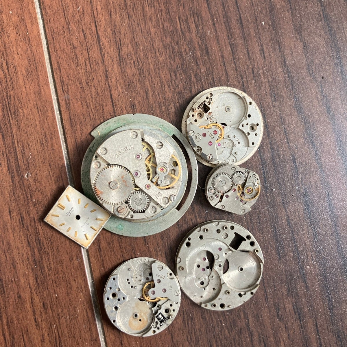 時計部品には人工ルビーが使われているので、ブラックライトで光ります。