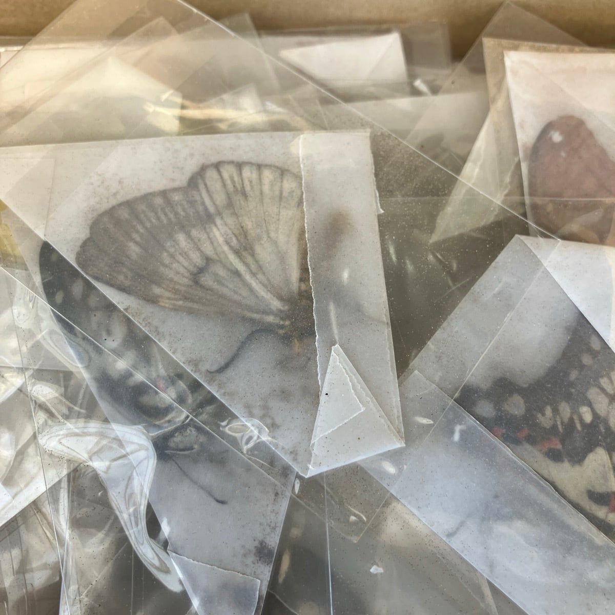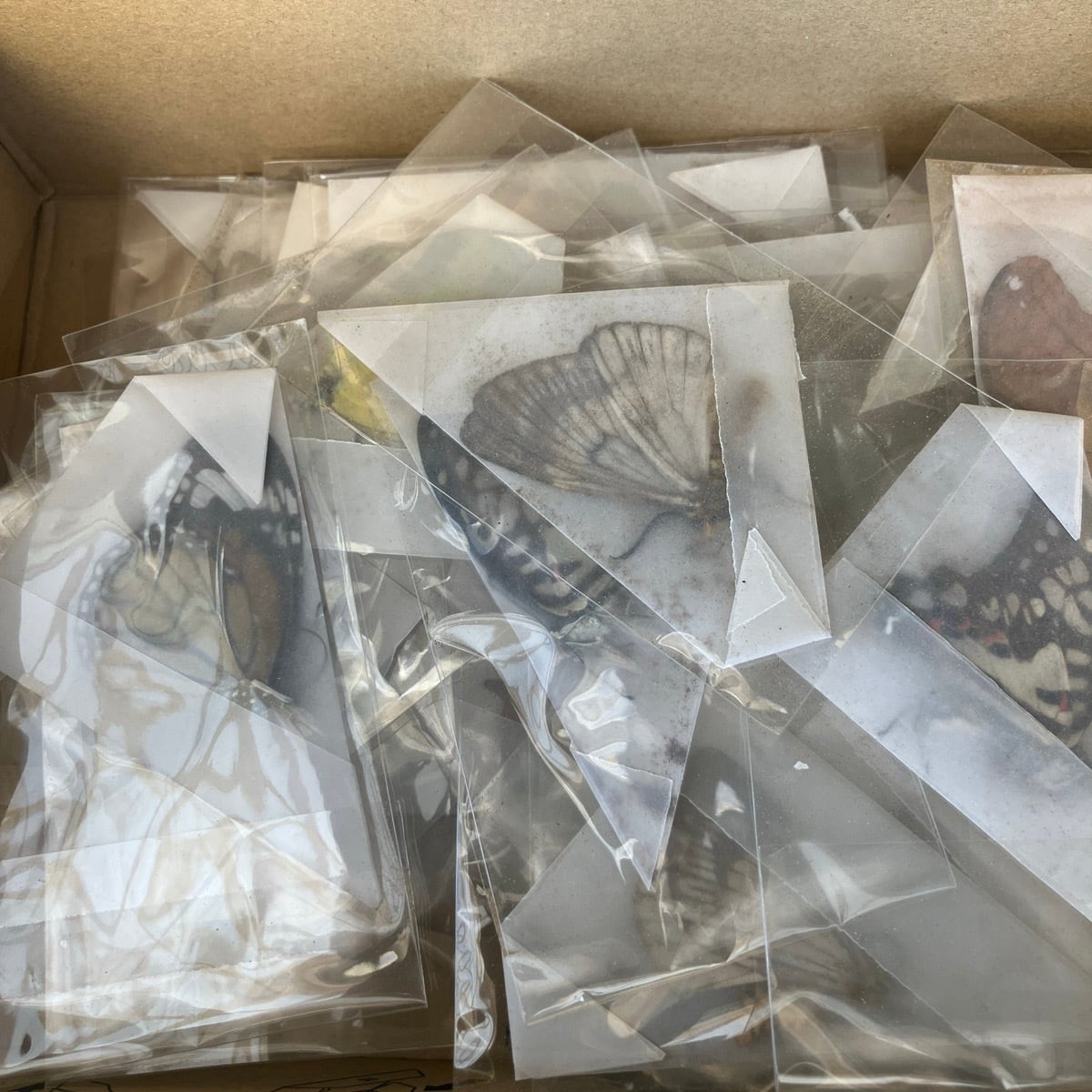 三角紙に挟まれた蝶の翅54頭分です(若干の数え間違いがあるかもしれません)。