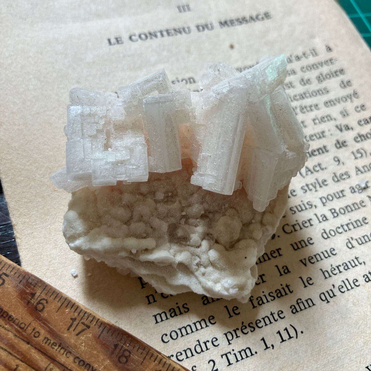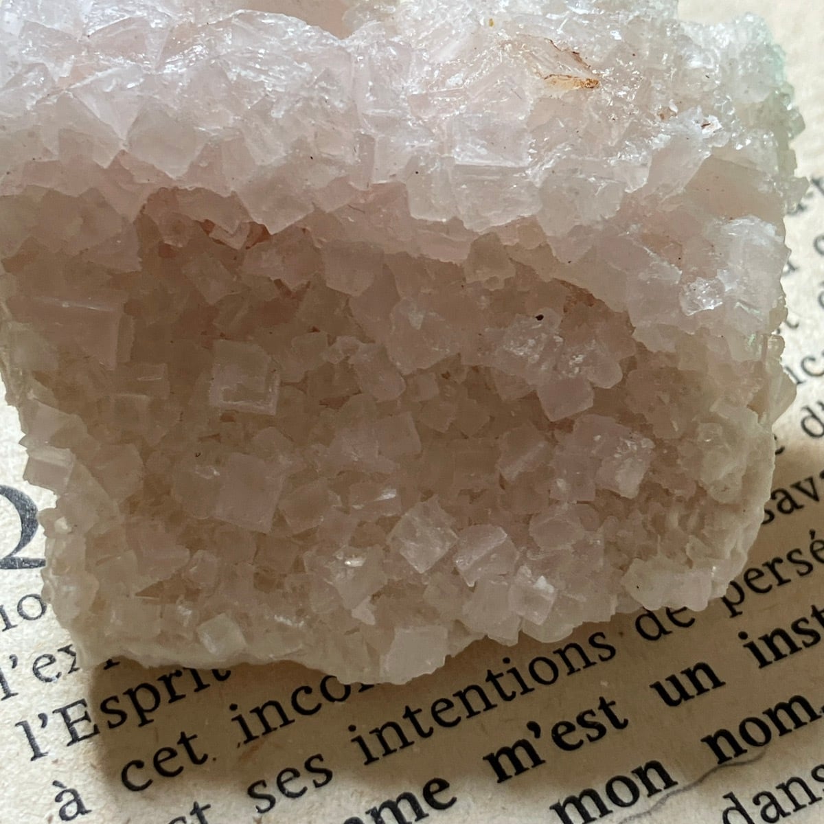 ラスベガスにほど近い、デスバレーなどの大きな国立公園が広がるカリフォルニア州にある塩湖オーエンズ湖産。湖に生息する藻などの有機物の影響によって、鮮やかなピンク色に色づいています。食塩の結晶は通常は立方体ですが、これは「ホッパー結晶」。ビスマスと同じ骸晶です。写真ではあまりピンク感ないのですが、肉眼では淡いピンクが、ちょうどいま満開のソメイヨシノみたいです。