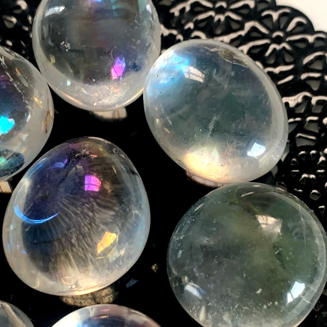 ブラジル産の水晶タンブルに金属を蒸着させた、レインボーオーラクォーツです。